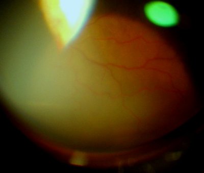 眼底:后极部视网膜渗出性脱离明显好转,后极部视网膜平伏,浅脱离,黄斑区仍然隆起。下方中周部仍可以见到隆起、皱褶脱离的视网膜。未见明显坏死灶。视网膜血管充盈扩张,右侧视乳头9点位可见线状出血