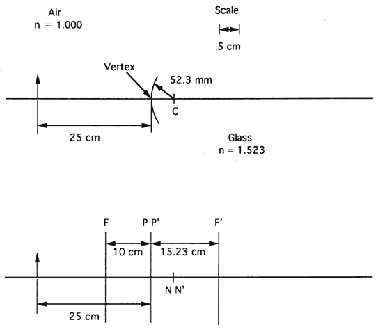 The primary focal point is nair/+ 10.00 D = 10.00 cm in front of the vertex. The secondary focal point is nglass/+ 10.00 D = 15.23 cm behind the vertex. The cardinal points are shown in Figure 88. Steps 2 through 8: These are illustrated in Figure 89.