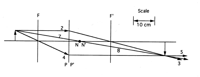The negative sign indicates that the system's secondary principal plane is to the left of the second surface's secondary principal plane. The focal length is 1/+ 8.92 D = 11.2 cm. RAY SKETCHOnce the reduced system is obtained, the ray sketch is fairly straightforward. A ray sketch for an object 25 cm in front of the primary principal plane is shown in Figure 99. The essential difference between this and previous examples is that now the principal planes do not overlap. Rays intersecting the primary principal plane emerge from the secondary principal plane at the same distance from the optical axis, but in a different direction (unless they go through the nodal points). Rays that go through the nodal points have the same direction but are displaced.