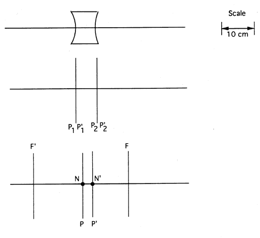 RAY SKETCH Although physically the lens has two surfaces, optically the lens is thin so it can be represented by a single surface. As in the case of a single refracting surface, the principal planes coincide. The difference between this and the previous examples is that the nodal points coincide with the principal points. The ray sketch is shown in Figures 93 and 94.