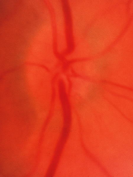 Fig. 9. Normal small disc with no cup because it is filled with neuroretinal tissue, which consists of the axons leaving the eye to form the optic nerve, along with the astroglia and the capillary bed.