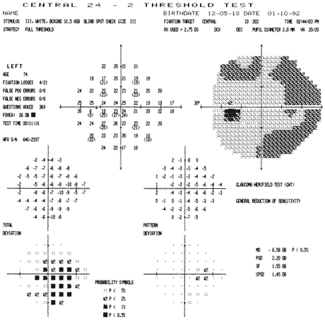It can be difficult to determine whether a new visual field examination shows progressive glaucomatous damage. The large amount of data generated by automated perimetry and the confusion caused by the large fluctuations of threshold response complicate interpretation.