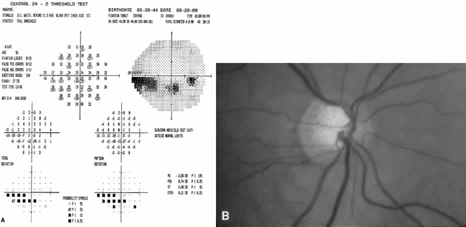 Fig. 35. A. Pure localized loss. There is an inferior visual field defect with similar number of probability symbols in both the total and pattern deviation maps. There is a very significant corrected pattern standard deviation with a borderline significant mean deviation. Note that the mean deviation becomes significant even with pure localized defects when the defect is extensive. B. Photograph of this patient's right optic nerve shows thinning superiorly causing the inferior field defect.