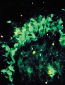 An electron-microscopic study of conjunctival epithelium from patients with CP showed increased desmosomes and prominent tonofilaments and tonofibrils throughout the epithelial cytoplasm. The basal lamina showed areas of discontinuity, duplication, and focal thickening. Collagen fibrils were highly disorganized, and the vascular space was reduced.30 A scanning electron-microscopic study of conjunctival surfaces demonstrated a homogeneous granular sheet of amorphous, mucin-like material covering extensive areas of the conjunctiva in patients with CP that was absent from normal subjects.31 IMMUNOPATHOLOGY CP is characterized by the binding of immunoglobulins (most commonly IgG) and components of both the classic and alternative complement pathways to the basement membrane zone of skin and oral mucosa.32,33 Circulating antibodies to the basement membrane zone can be demonstrated occasionally, and decreased serum levels of interleukin-6 and increased serum levels of tumor necrosis factor-alpha may be present.33,34 OCP and bullous pemphigoid antigens are distinct but have a common localization within the lamina lucida of the dermal-epidermal junction.35 Patients with systemic features of CP may also have antigens in the lamina densa.36 The bullous pemphigoid antigen is present on the blister roof in close association with basal cells; CP antigen is present on the blister floor. Conjunctival biopsies taken from patients with CP demonstrate immunoglobulins and complement bound to the basement membrane (Fig. 9) 24,37–43 One targeted basement membrane component may be laminin.44 The destruction of laminin, which normally binds basal epithelium to its basement membrane, leads to blister formation.45 An animal model of subepithelial blistering diseases has been developed using antilaminin antibodies in neonatal mice.46 Further damage causes fragmentation of the basement membrane and subsequent repair with aberrant forms of basement membrane collagen.47 Immunoglobulin deposition on the conjunctival basement membrane also may be found in other diseases.24,38,43,48
