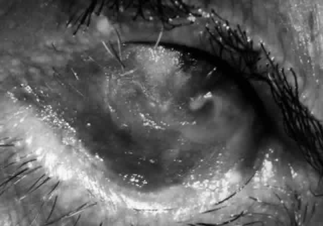 Ocular Manifestations Clinically, the ocular disease in cicatricial pemphigoid (OCP) may present unilaterally in the form of a chronic, recurrent catarrhal conjunctivitis, but it eventually becomes bilateral. Subepithelial fibrosis is characteristic of stage 1 of OCP (Fig. 7). Stage 2 shows fornix foreshortening (Fig. 8), and symblepharon formation is the hallmark of stage 3 (Fig. 9). Stage 4, end-stage disease, is characterized by ankyloblepharon and surface keratinization (Fig. 10). Obstruction of the lacrimal ductules and meibomian gland ducts eventually produces an unstable tear film and progressive sicca syndrome, but it is to be emphasized that OCP is not a dry-eye syndrome until late in the disease course.20 Trichiasis and entropion occur because of the subepithelial fibrosis, with eventual keratopathy, corneal neovascularization, and corneal ulceration and scarring.20
