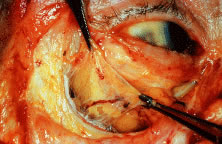 In the Asian eyelids, the eyelid creases vary in position in relation to the eyelid margin and may be lower than the occidental eyelid, or they may be absent altogether. In the upper eyelid, the orbital septum may fuse with the aponeurosis as is inserts into the tarsus. This insertion can occur as high as the superior border of the tarsus or as low as the lash line accounting for the lower or absent upper eyelid crease.3 There are also differences in the Asian lower eyelids. Epiblepharon is a common finding in the Asian lower eyelid and is seen as an additional fold of skin running horizontally below the lower eyelid margin. It is often associated with a loss of the eyelid crease or with a crease that rests very close to the eyelid margin of the lower eyelid. The absence of an eyelid crease may be due to lack of deep anchoring of the superficial skin to the preseptal portion of the orbicularis oculi muscle.18 An overriding orbicularis muscle is also associated with epiblepharon. The weight of the skin fold and the orbicularis muscle may rotate the lower eyelid margin inward, creating an entropion. FAT Fat within the orbit and eyelids serves as a protective cushion for the globe and facilitates movement of the globe. There are three general locations of fat that are described: eyelid, sub-brow, and orbital. In the upper eyelid, there are two fat pads, medial and central (preaponeurotic) (Fig. 12). The central preaponeurotic fat is divided by the trochlea of the superior oblique tendon and fascial strands of the medial retinaculum. These divisions are arbitrary and the fascial planes can be variable, because eyelid fat is interconnected and contiguous with deeper orbital fat. The preaponeurotic fat pad is an important surgical landmark, because it lies just posterior to the orbital septum and anterior to the levator aponeurosis (Fig. 13). The central preaponeurotic fat pad tends to be yellow as compared with the whiter more fibrous medial fat pad. The medial fat pad is derived from orbital fat deep to the levator muscle. It is more vascular because of the location of the palpebral arterial arcade that serpiginously courses through the medial fat pad.19,20 The lacrimal gland occupies the temporal space lateral to the central preaponeurotic fat pad. The lacrimal gland is a firm, pink, vascular, lobulated structure that produces the aqueous component of the precorneal tear film. (The anatomy and function of the lacrimal gland is described later in the chapter.) Care must be taken to avoid excision of the lacrimal gland while liposculpturing during blepharoplasty. Fine connective tissue septa extend anteriorly from the capsule of preaponeurotic fat to the orbital septum and posteriorly to the levator aponeurosis.17 The postaponeurotic or pretarsal space, located between the levator aponeurosis anteriorly and the tarsus posteriorly, may contain a small amount of peripheral orbital fat. The fibrous septa compartmentalizing superficial and deep orbital fat and extensions of the fascial sheaths of the orbital muscles and eyelid structures are of great importance to the movement of the upper eyelid.