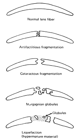 After these early changes, the degeneration of individual fibers then proceeds either anteriorly, posteriorly, or in both directions of the fibers (Fig. 6). On histologic examination, more advanced cortical cataracts show areas of interrupted cortical fibers with fine granules and larger globules intermixed (Fig. 7, Color Plate 1D).42 Eventually, the entire cortex may be liquefied, allowing the nucleus to float within it; this is termed a mature cataract (Fig. 8).