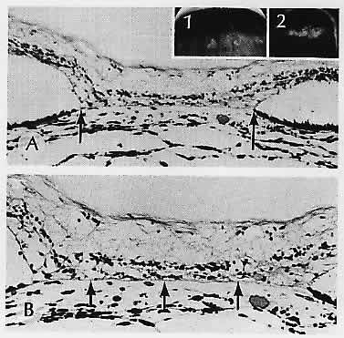 Fig. 4. Paving stone degeneration. A. The retinal pigment epithelium (RPE) ends abruptly in the area of degeneration (between arrows). Insets 1 and 2. Typical circumferential lesions of paving stone degeneration. B. Higher magnification of (A). In the area of RPE disappearance, Bruch's membrane (arrows) is intact, but the overlying retina (especially the outer layers) and the underlying choroid show degenerative changes. (A, H&E, ×69; inset 1, macroscopic; inset 2, macroscopic; B, H&E, ×101)