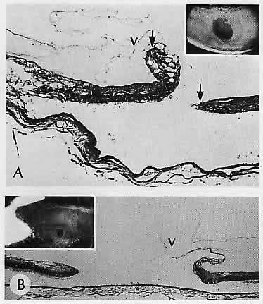 Fig. 6. Emboli. A. Retinal vessel on the left (v) is occluded by an osmophilic fat globule. A smaller fat globule (arrow) is seen in the vessel on the right. The retinal arteriole fat emboli followed closed-chest cardiac massage. B. Cholesterol embolus in a retinal artery (arrow). Inset 1. Higher magnification of the embolus. Inset 2. Clinical appearance of a cholesterol embolus (arrow) in the same eye prior to enucleation. Multiple cholesterol emboli (Hollenhorst plaques) were present in the fundus of a 67-year-old man with carotid artery stenosis. (A, PD ×300; B, H&E ×40; inset 1, H&E × 101; inset 2, clinical)